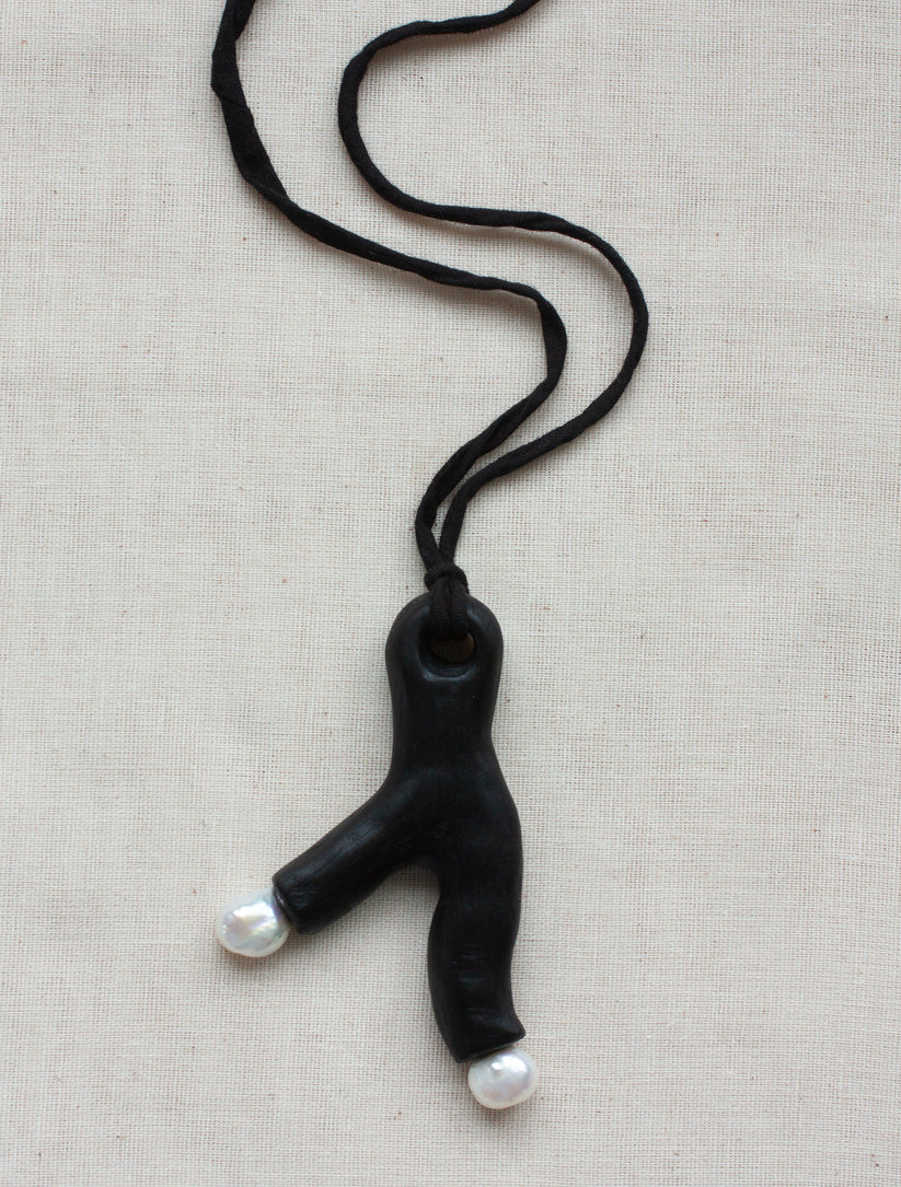 Inspired by the natural architecture of coral, this pendant is carved by hand from exclusive ebony wood. Its organic, flowing form captures the rhythm of the sea, while two luminous freshwater pearls anchor the piece with quiet elegance.